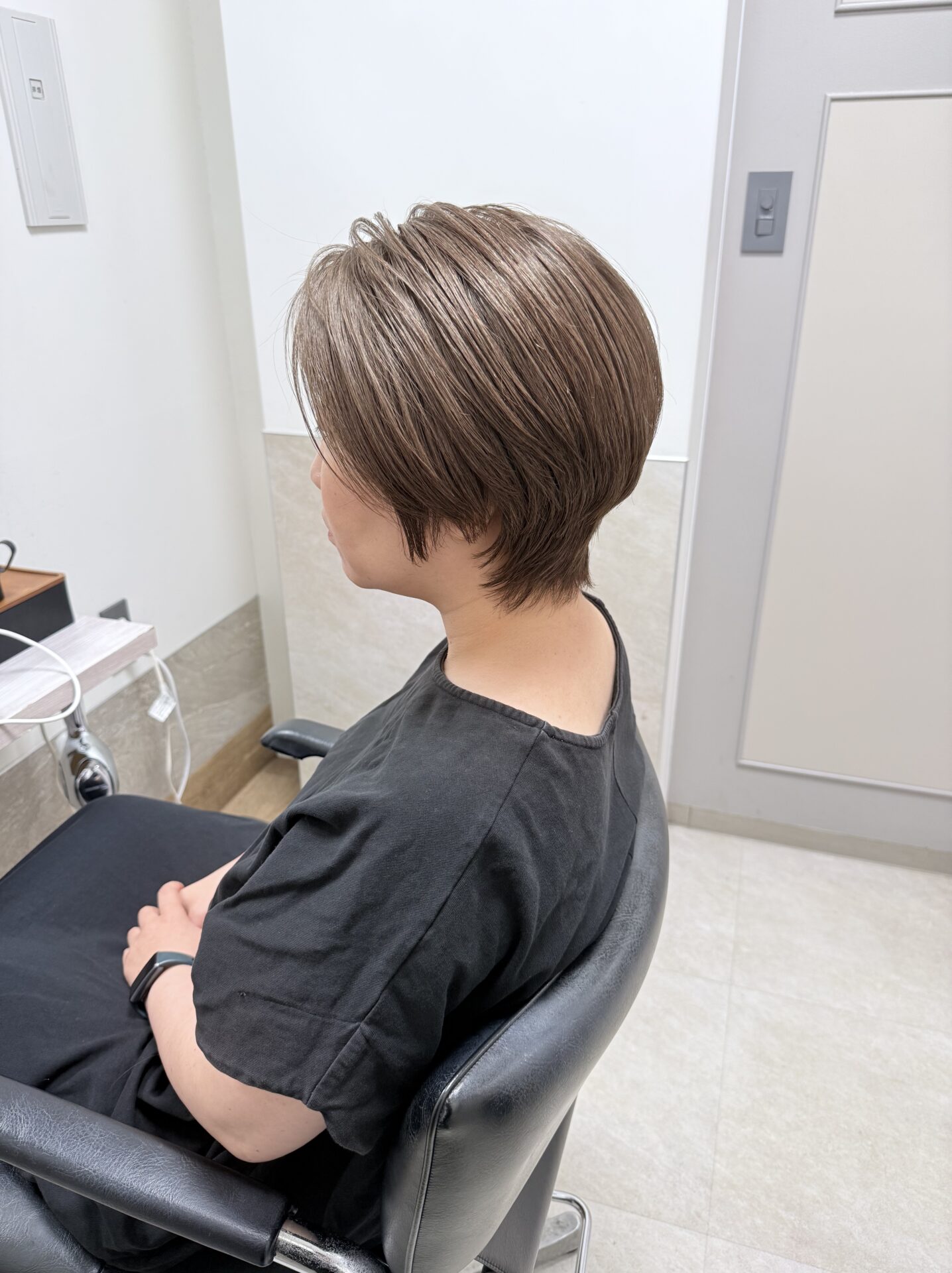 その白髪を生かして明るめのカラーをすることでやわらい雰囲気で透明感のあるベージュに仕上げています。