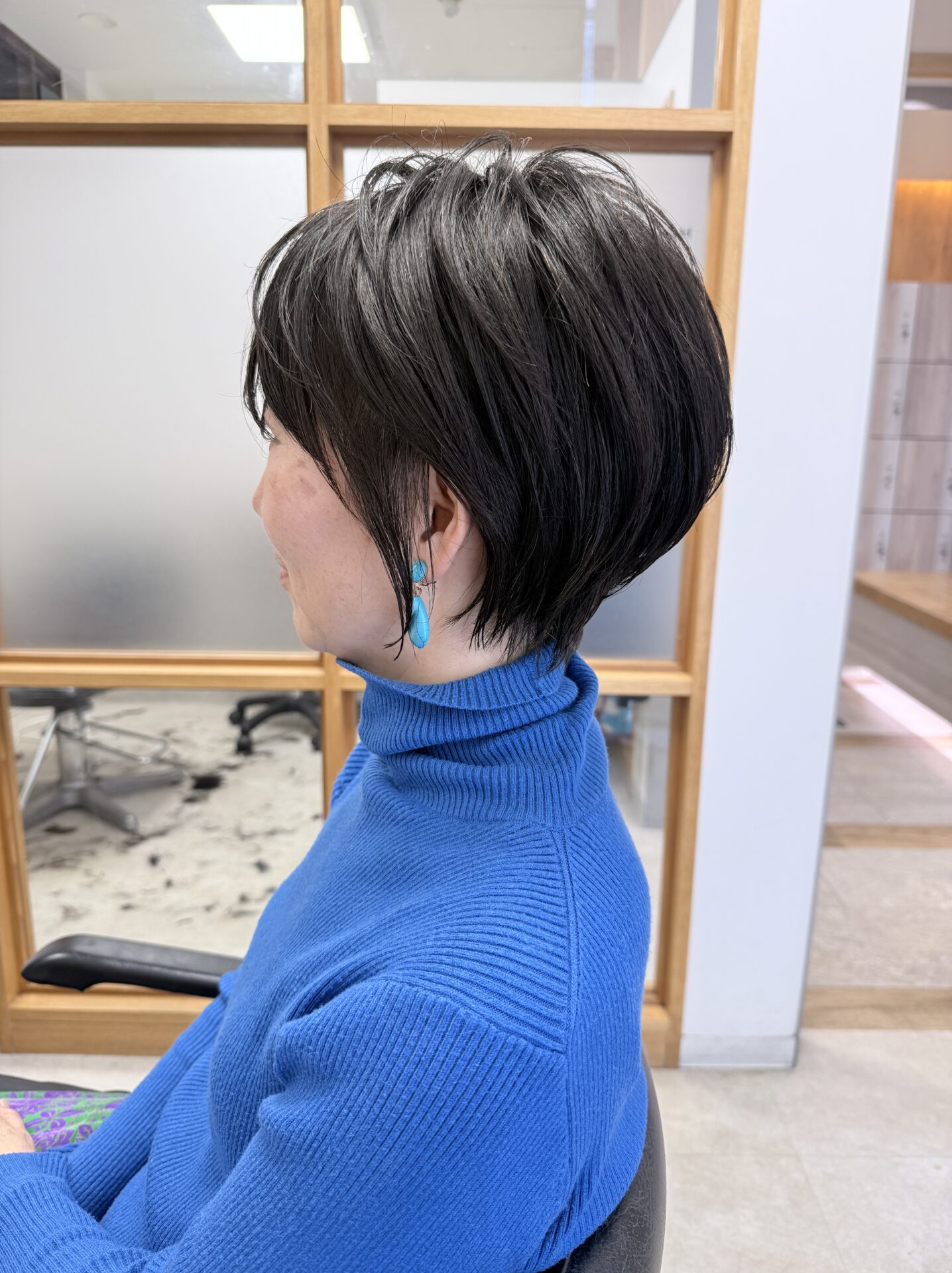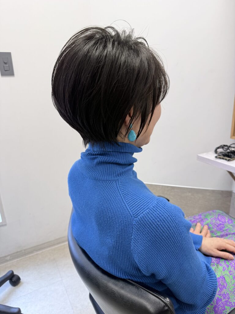 形、バランスは全体的に丸みのあるフォルムで柔らかい雰囲気を出します。ポイントは毛先が丸く収まるという有よりかは全体の形が丸くなるようにすること。なので、見た目はショートでも意外と長さは残しているのがこのスタイルの特徴です。